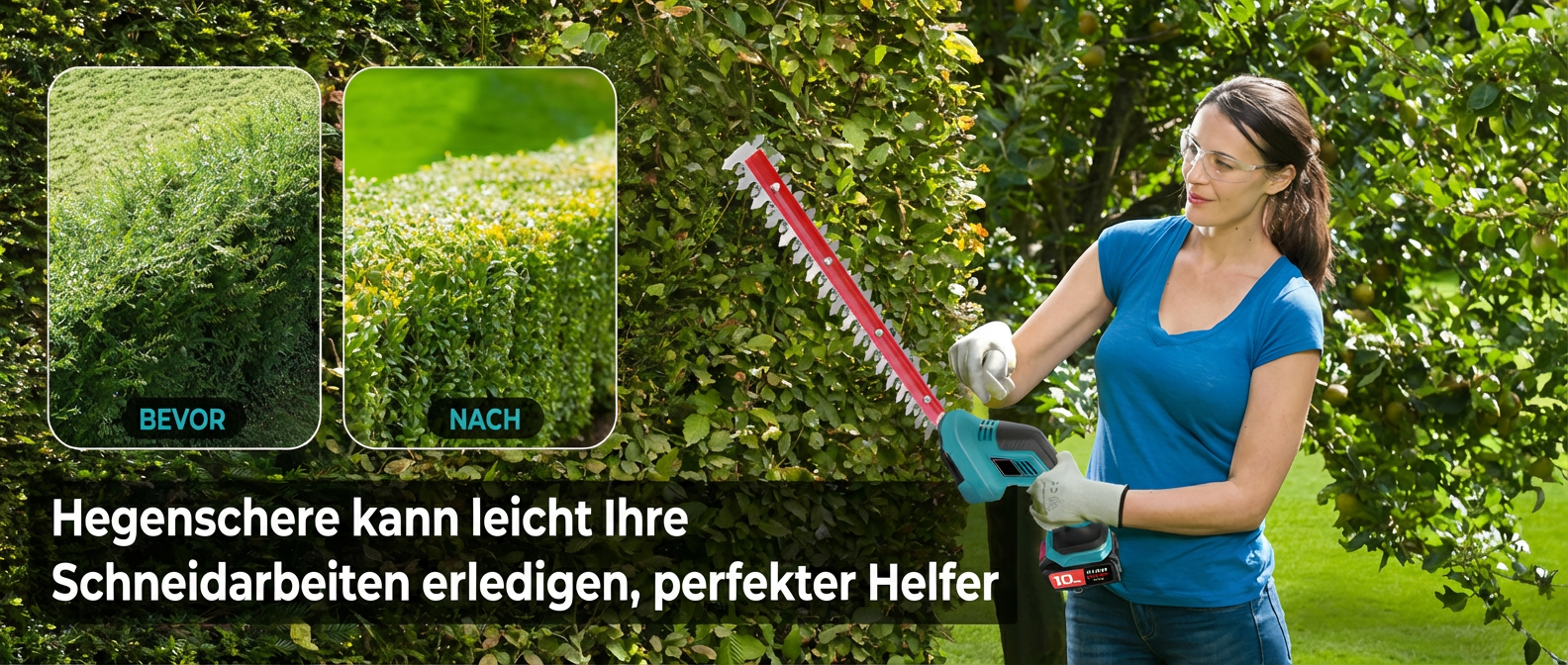 Die leistungsstarken Klingen schneiden schnell und präzise, sodass Ihre Hecken und Sträucher im Handumdrehen ein gepflegtes und ordentliches Aussehen erhalten.