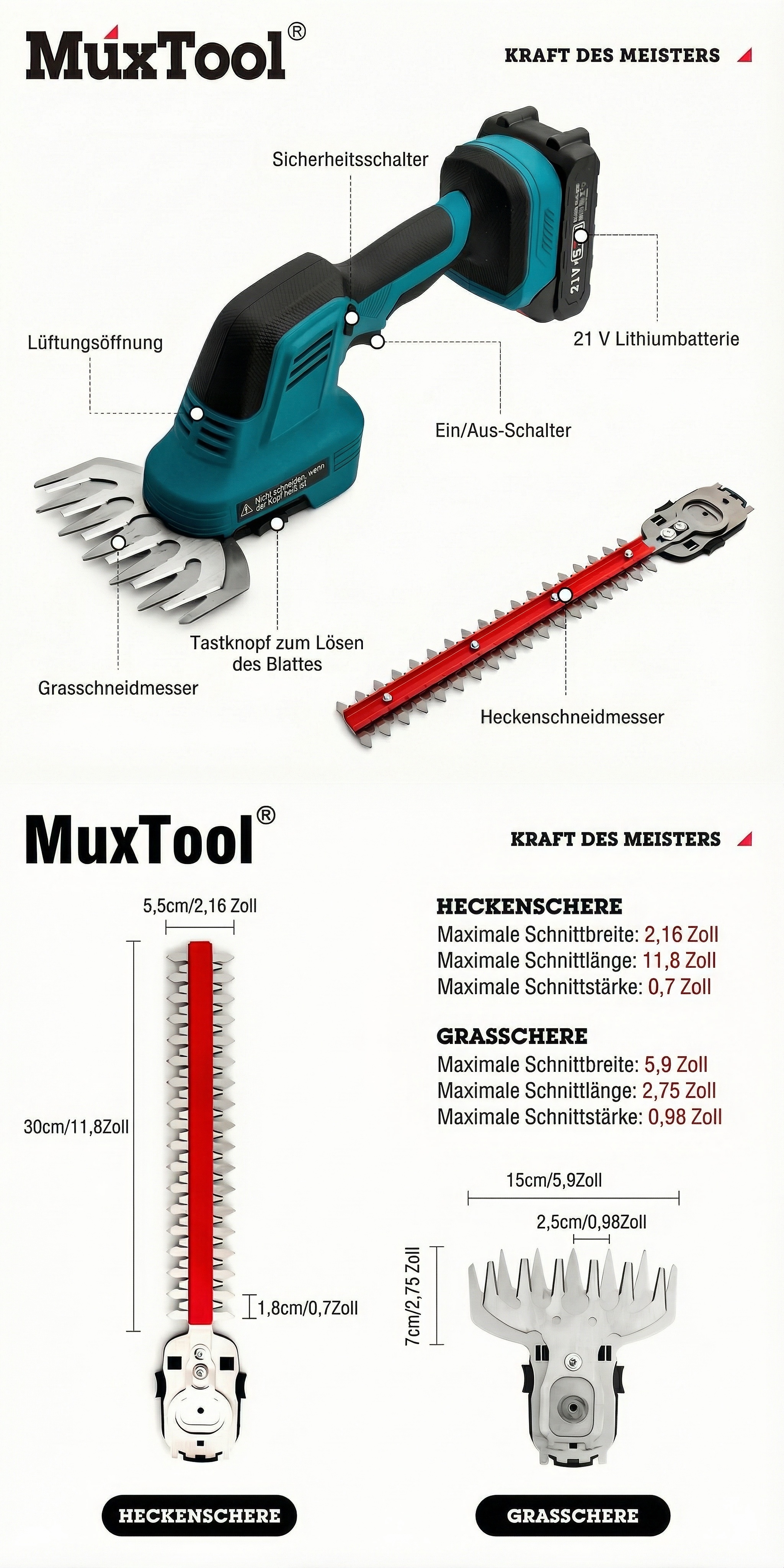 Diese elektrische Heckenschere ist mit einer praktischen Taste zum Klingenwechsel ausgestattet, die es ermöglicht, schnell und einfach zwischen einer 6‑Zoll‑breiten Gras‑Klinge und einer 12,2‑Zoll‑langen Strauch‑Klinge zu wechseln.