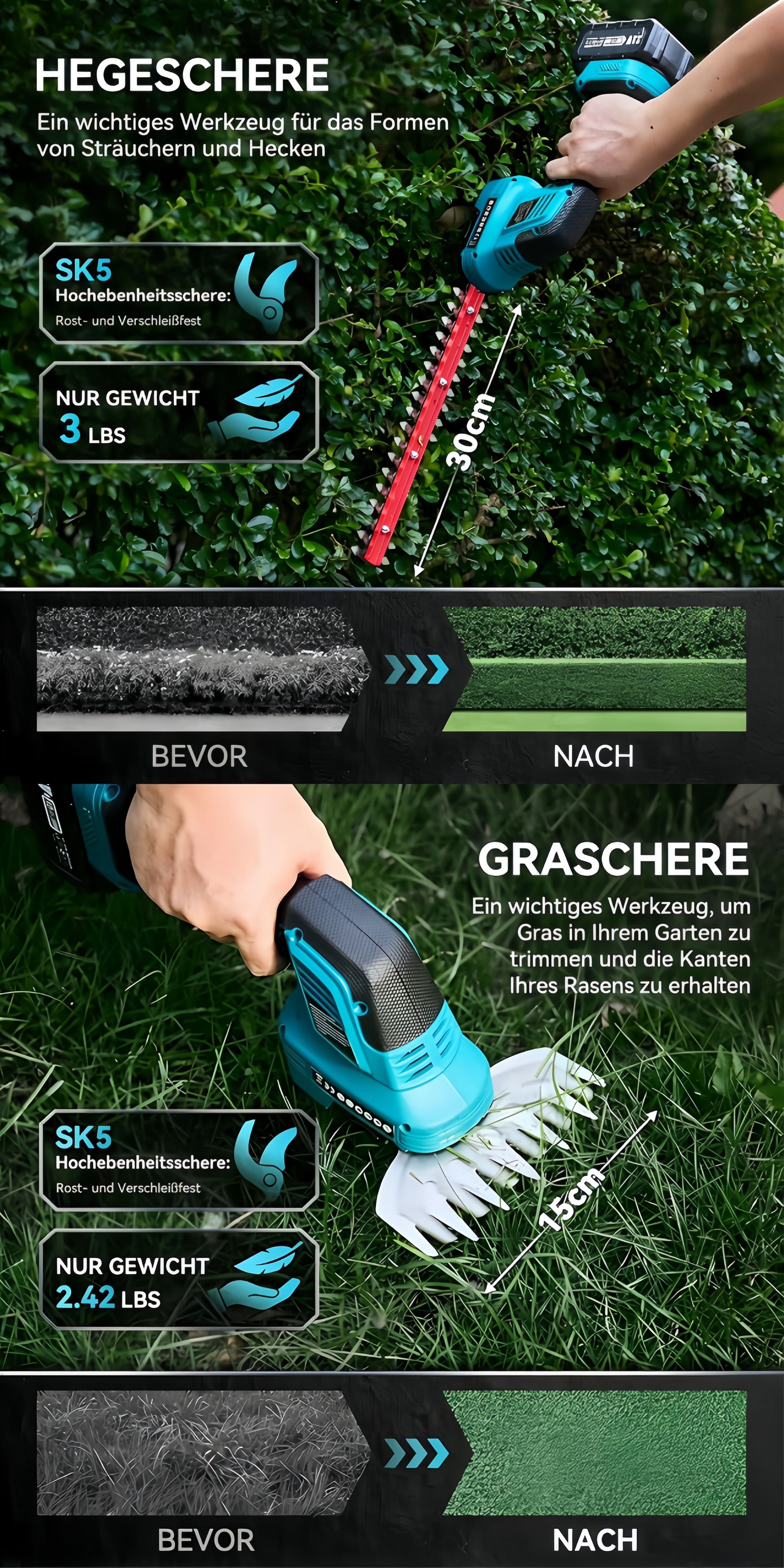 Egal, ob Sie Sträucher formen, Hecken schneiden oder Rasenkanten nacharbeiten möchten – Sie erzielen stets ein sauberes und professionelles Ergebnis.
