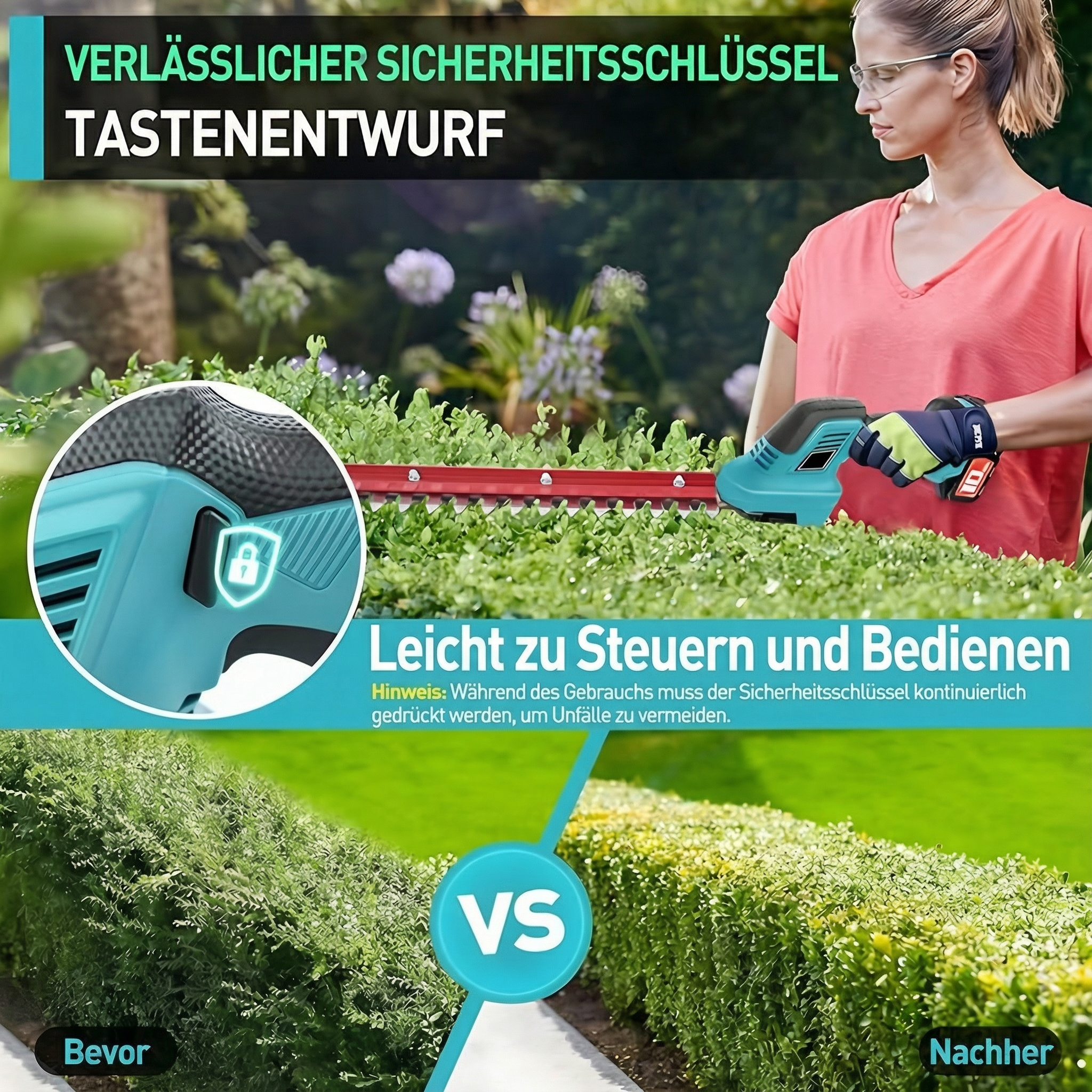 Diese elektrische Heckenschere ist mit einem zuverlässigen Sicherheitsknopf und einem ergonomischen Griff ausgestattet, die für mehr Sicherheit, Komfort und Kontrolle beim Arbeiten sorgen.